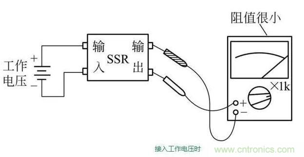 在zai上shang一yi步bu檢jian測ce的de基ji礎chu上shang,給gei固gu態tai繼ji電dian器qi輸shu入ru端duan接jie入ru規gui定ding的de工gong作zuo電dian壓ya,這zhe時shi固gu態tai繼ji電dian器qi輸shu出chu端duan兩liang引yin腳jiao之zhi間jian應ying該gai導dao通tong,萬wan用yong表biao表biao針zhen指zhi示shi阻zu值zhi很hen小xiao。