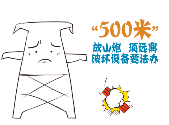 任何單位或個人不得在距電力設施周圍500米範圍內(水平距離)進jin行xing爆bao破po作zuo業ye。因yin工gong作zuo需xu要yao必bi須xu進jin行xing爆bao破po作zuo業ye時shi,應ying當dang按an國guo家jia頒ban發fa的de有you關guan爆bao破po作zuo業ye的de法fa律lv法fa規gui,采cai取qu可ke靠kao的de安an全quan防fang範fan措cuo施shi,確que保bao電dian力li設she施shi安an全quan,並bing征zheng得de當dang地di電dian力li設she施shi產chan權quan單dan位wei或huo管guan理li部bu門men的de書shu麵mian同tong意yi,報bao經jing政zheng府fu有you關guan管guan理li部bu門men批pi準zhun。