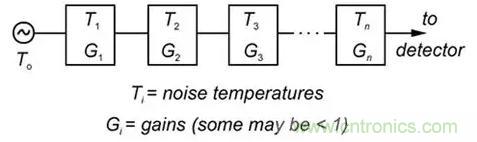 圖1:以天線或其他來源的等效噪聲溫度為起點,累加各階段的噪聲溫度可確定係統中各點的噪聲。(圖片來源:新澤西理工學院)