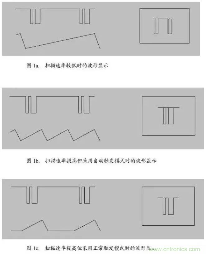 圖1 是這種情況的圖解,在圖1 中,左側上方是被觀測的波形,下方是掃描波形,右側是波形的顯示。圖1a中掃描速率較低,不便於觀察波形的細節;圖1b將掃描速率提高,采用自動觸發模式,這時顯示的波形是不清晰的,有混疊現象;圖1c中的掃描速率與圖1b相同,但采用正常觸發方式,僅在有觸發時才進行掃描,因而顯示清晰的波形。