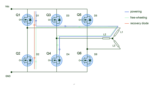 步驟1)功率級同時給兩個相位供電,而對第三個相位未供電。假設供電相位為L1、L2,L3未供電。在這種情況下,MOSFETQ1和Q2處於導通狀態,電流流經Q1、L1、L2和Q4。