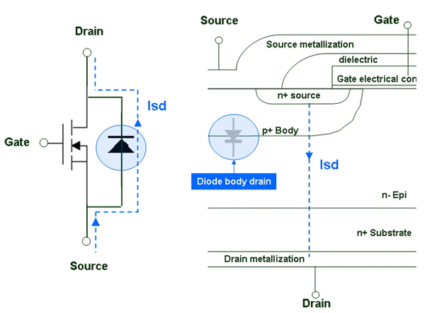 圖2:MOSFET器件的截麵圖,電流流經其內部的體二極管[page]