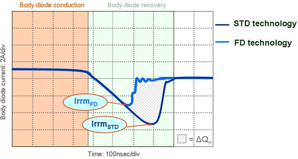 為改善在這些特殊應用中體二極管的性能,研發人員開發出具有快速體二極管恢複特性MOSFET。當二極管導通後被反向偏置,反向恢複峰值電流Irrm較小,完成恢複所需要的時間更短(見圖3)。
