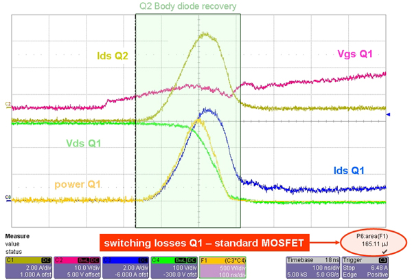 當MOSFETQ1導通時,二極管D2被反向偏置,N區的少數載流子進入P+體區,反之亦然。這種快速轉移導致大量的電流流經二極管,從N-epi到P+區,即從漏極到源極。電感L1對於流經Q2和Q1的尖峰電流表現出高阻抗。Q1表現出額外的電流尖峰,增加了在導通期間的開關損耗。圖4a描述了MOSFET的導通過程。
