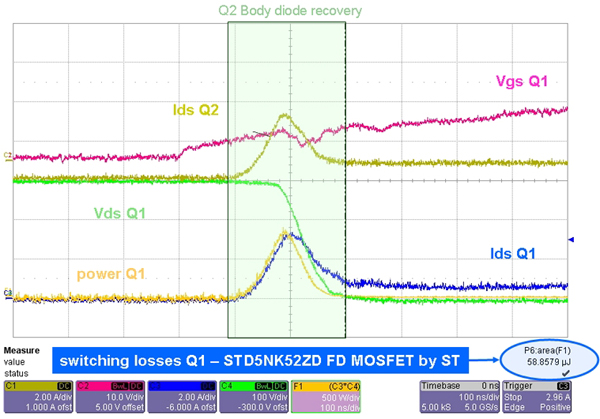 我們對比測試了標準的MOSFET和快恢複MOSFET。ST推出的STD5NK52ZD(SuperFREDmesh係列)放在Q2(LF)中,如圖4b所示。在Q1MOSFET(HF)的導通工作期間,開關損耗降低了65%。采用STD5NK52ZD時效率和熱性能獲得很大提升(在不采用散熱器的自由流動空氣環境下,殼溫從60°C降低到50°C)。在這種拓撲中,MOSFET內部的體二極管用作續流二極管,采用具有快速體二極管恢複特性MOSFET更為合適。