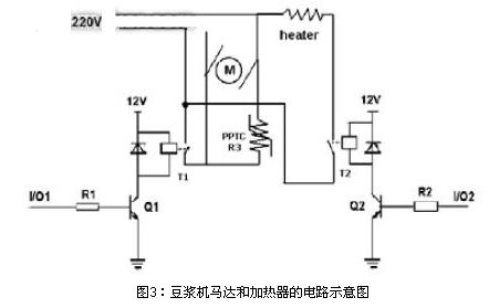 下圖3為多功能豆漿機馬達和加熱器的簡單電路示意圖。豆漿機所用馬達為220V直流馬達,繼電器的工作電壓為12V,豆漿機利用繼電器把MCU發出的低壓控製信號I/O來控製交流高壓信號的通斷,R3為PPTC可恢複電阻,T1和T2為繼電器。