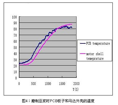 用上文所述的PPTC設計流程可以用在多功能豆漿機馬達防堵保護設計中,但這是往往會碰到選擇PPTC型號困難的問題,也就是說多功能豆漿機的馬達保護設計會較普通的小家電馬達保護複雜的多,圖4為磨製豆漿時PCB板周圍環境溫度和馬達外殼溫度的實測圖,可見控製電路PCB板PPTC周圍的環境溫度最高可以到達85C。由於豆漿機的PPTC最高環境溫度85度會比普通的小家電最高環境溫度要求高,這樣既要在85度的最大工作電流下能正常工作,還要保證在最低溫度0度的堵轉電流情況下能及時的保護,相應的就增大了設計難度。下麵就具體的闡述此類多功能豆漿機馬達堵轉的保護設計方案。