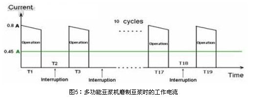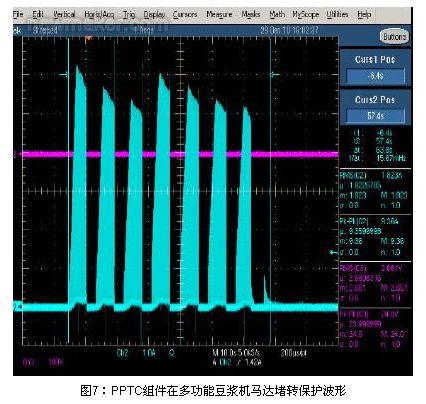 圖6為多功能豆漿機的堵轉電流。在榨水果的堵轉情況下,實測馬達的堵轉最大電流為2A,由於榨果汁時馬達也不是一直連續工作的,也是間隔一定時間工作,間隔時間是馬達工作6S,停3S,這樣換算成在一個榨水果完整工作周期內平均電流是1.6~1.7A。在1.6~1.7A堵轉電流下,馬達堵轉需要保護的時間要求在150S內。