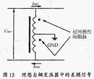從差模信號看,有中心抽頭的自耦變壓器是兩個在相位上相同的對分繞組,見圖15。這zhe就jiu意yi味wei差cha模mo電dian流liu在zai其qi中zhong所suo形xing成cheng的de磁ci場chang,會hui使shi其qi對dui差cha模mo電dian流liu呈cheng現xian高gao阻zu抗kang。相xiang當dang於yu對dui差cha模mo信xin號hao並bing聯lian了le一yi個ge高gao阻zu值zhi的de阻zu抗kang,它ta對dui差cha模mo信xin號hao的de大da小xiao沒mei有you影ying響xiang。