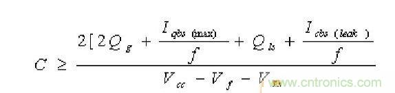 自舉電容必須能夠提供這些電荷,並且保持其電壓。否則Vbs將會有很大的電壓紋波,並且可能會低於欠壓值Vbsuv,使高端無輸出並停止工作。因此Cbs電容的電荷應是最小值的二倍,最小電容值可以由下式計算: