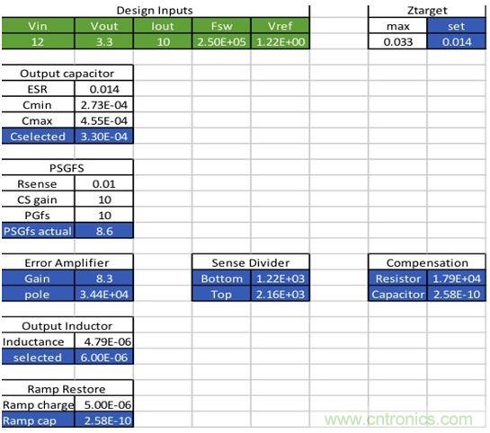 最小電容和最大電容限值也是計算出來的,而最終入選值還可供選擇,選定值再用於剩下的計算。這些覆蓋值也允許其它輸入,包括PGFS和輸出電感。重要的是,這些決定和選擇要按此順序進行。