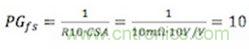 LM25116評估板的功率級跨導由10mΩ的電流檢測電阻(R11)和電流檢測放大器增益(10)設定,並滿足10A的電流極限。最終的功率級跨導等於: