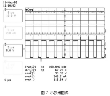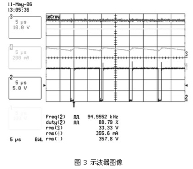 圖 2 、圖3 及表 2、表3 顯示了這種電路在90 ~265 VAC的通用輸入電壓範圍內,以350 mA驅動兩個有6個串聯LUXEON FLOOD 25-0032 HB-LED板時的結果。表 2 顯示了在輸入電壓範圍內良好的電流調節。圖 2 和圖3 說(shuo)明(ming)了(le)正(zheng)如(ru)理(li)論(lun)所(suo)示(shi)的(de),由(you)於(yu)占(zhan)空(kong)比(bi)較(jiao)小(xiao),輸(shu)入(ru)電(dian)壓(ya)較(jiao)高(gao)時(shi)紋(wen)波(bo)較(jiao)差(cha)。這(zhe)表(biao)明(ming)在(zai)主(zhu)電(dian)壓(ya)較(jiao)低(di)的(de)地(di)區(qu),如(ru)北(bei)美(mei)和(he)日(ri)本(ben),設(she)備(bei)性(xing)能(neng)更(geng)加(jia)良(liang)好(hao)。然(ran)而(er),即(ji)使(shi)在(zai)最(zui)差(cha)的(de)條(tiao)件(jian)下(xia),隻(zhi)要(yao)控(kong)製(zhi)器(qi)輸(shu)入(ru)電(dian)壓(ya)保(bao)持(chi)在(zai)90 ~265 VAC的範圍內,仍可對電流進行適時調節。同時對隻使用6個HB-LED板的係統進行了測量(見表 3) ,對比結果發現,±1.3%的調節差距導致負載電壓的差距高達33.4V ~16.4V。