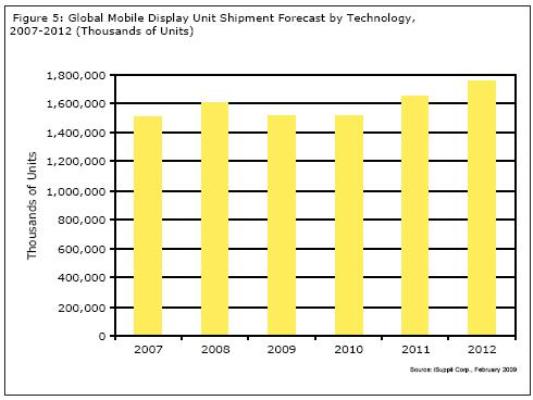 圖5所示為iSuppli公司對於2007-2012年手機顯示器市場的預測。