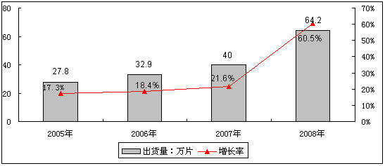 圖1 2005-2008年中國OLED產業出貨量及增長率