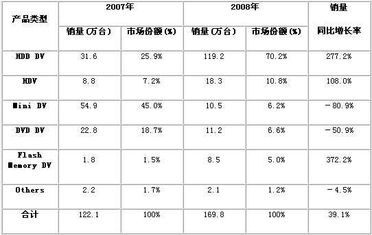 - HDD DV和Flash Memory DV同比2007年都有超過250%以上的增長