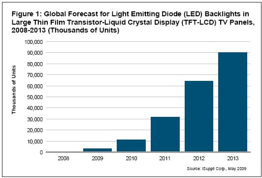iSuppli公司預測,2009年電視產業對LED背光的接受率將為3%,到2012年將上升到30%,2013年達到39%。這相當於2013年將有9000萬個采用LED的LCD電視麵板出貨,而2008年隻有43.8萬個LED電視麵板,期間的複合年增長率高達190.1%。