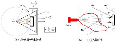 如圖4所示,點光源光強在空間各方向均勻分布,在不同距離處用不同接收孔徑的探測器接收得到的測試結果都不會改變,但是LED由於其光強分布的不一致使得測試結果隨測試距離和探測器孔徑變化。因此,CIE-127提出了兩種推薦測試條件使得各LED在同一條件下進行光強測試與評價,目前CIE-127條件已經被各LED製造商和檢測機構引用。
