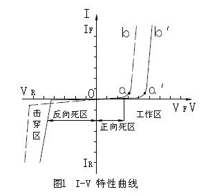 (1) 正向死區:(圖oa 或oa′段)a點對於V0 為開啟電壓,當V<Va,外加電場尚克服不少因載流子擴散而形成勢壘電場,此時R很大;開啟電壓對於不同LED其值不同,GaAs 為1V,紅色GaAsP 為1.2V,GaP 為1.8V,GaN 為2.5V。