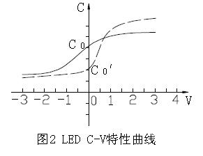 鑒於LED 的芯片有9×9mil (250×250um),10×10mil,11×11mil (280×280um),12×12mil (300×300um),故pn 結麵積大小不一,使其結電容(零偏壓)C≈n+pf左右。C-V 特性呈二次函數關係(如圖2)。由1MHZ 交流信號用C-V 特性測試儀測得。