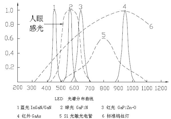 LED 的光譜分布與製備所用化合物半導體種類、性質及pn結結構(外延層厚度、摻雜雜質)等有關,而與器件的幾何形狀、封裝方式無關。