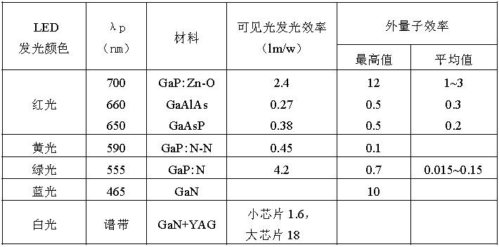 以下列出幾種常見LED 流明效率(可見光發光效率):