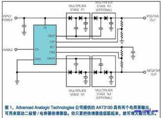 AdvancedAnalogicTechnologies公司的副總裁JanNilsson評述道:“許多手機、數碼相機及其它便攜式設備中的有源矩陣LCD和OLED……子係統要求正負兩種小電流偏置電源。”這種情況使得電源前景複雜化。AdvancedAnalogicTechnologies公司推出的AAT3190能滿足這種需求,因為它借助一塊采用自同步雙電荷泵體係結構其工作於標稱1MHz的開關頻率芯片來生成正負兩種電源(圖1)。這種電荷泵可利用2.7V~5.5V的單極性輸入電源產生最大可達±25V的可調輸出電壓。