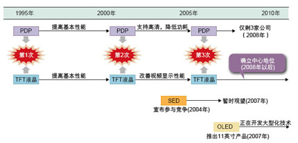 在液晶顯示器市場剛開始啟動的1998年,當時的夏普公司社長(現任董事長)町田勝彥的發言震驚了整個行業。他表示: “到2005年,夏普在日本國內銷售的電視將全部采用液晶屏。” dangshi,yejingdianshibingweipuji,zaixiapugongsineibuduiyucaiseyejingpingyebingmeiyoushizudebawo。danshi,zheyijuhuachengweiyejingdianshisaodangshichangdedaohuosuo,nayihou,yejingdianshiyichaohudingtianshengyanyuxiangdejingrensudutuiguangkailai。zaiciguochengzhong,yejingyuPDP(等離子)、SED(表麵傳導電子發射顯示)等技術展開了激烈的競爭(見圖3)。
