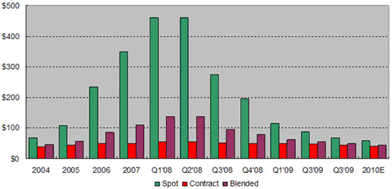 太陽能電池製造商把重點放在降低成本以維持一定獲利率的同時,也將持續推動電價往Grid Parity (太陽發電成本與傳統發電成本相當)的方向進行。主要降低成本的方法包括使用較少的矽,或使用較便宜的矽。多晶矽(Polysilicon)是主要用於製造結晶矽(c-Si)太陽能電池的晶圓材料。而其占到整體太陽能模塊成本的15%到20%。由於大量多晶矽新產能的開出以及過去這一年的需求減少,矽晶的價格自2008年下半年起因供過於求而大幅下跌,目前雖然跌勢已經趨緩,但預計2010年仍為供過於求的狀況,因此價格將持續下降。圖2為多晶矽價格趨勢。