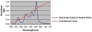 多通道驅動器:就給定的色溫而言,高質量CRI(90以上)會需要多種類型的LED。CRI是光源的光譜能量分布(SPD)的一個函數。SPD是指給定波長(頻率)下光源的輻射量。CRI數值表現最好(97以上)的白熾燈工作壽命較短(750~2500小時),效率也較低(美國能源部的數據為10~17Lm/W)。圖2顯示了白熾燈的SPD曲線與RGB光源曲線的對比情況。