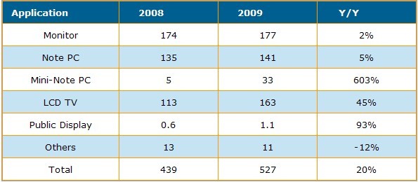雖然液晶顯示器對大尺寸液晶麵板而言是一個較成熟的市場,2009年出貨量僅較2008年成長2%,而與2007年相同。筆記型計算機與迷你筆記本電腦用麵板合計出貨達一億7千500萬片,2009年年成長率約25%。電視麵板表現最為亮眼,出貨量成長45%,達1億6千300萬片。另外,公眾顯示器麵板出貨成長93%,從90萬片成長到110萬片。