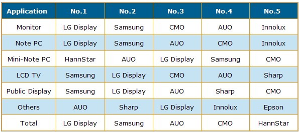以2009年大尺寸液晶麵板出貨片數排名來看,LGD以市占率24.9%居冠,而Samsung以0.4%些微差距居次,市占率24.5%,AUO市占率為17%,CMO市占率為14.2%。以出貨麵積與出貨金額來看,則是由Samsung居冠。以地區別來看,2009年韓國麵板廠出貨麵積有大幅提高,從2008年的46.2%,成長到2009年的52.8%。