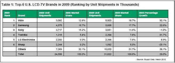 據iSuppli公司,Vizio在2009年成為美國市場的領先液晶電視品牌,而三星電子則在總體平板電視市場排名第一。
