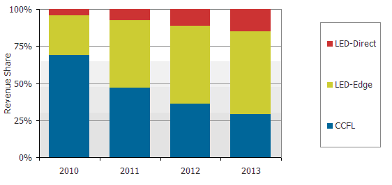 DisplaySearch全球電視出貨調查中,同時追蹤不同背光源液晶電視出貨狀況,並細分有直下式與側光式LED背光等不同市場。2010年整體來看,幾乎90%的液晶電視將以側光式為主,主要是因為使用少量的LED與成本較低,也能實現薄形化與亮度上的要求。