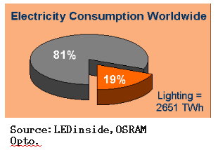 依現階段照明占全球電力消耗的比重達19%,耗能總量達到2651 TWH。如果能夠將現有的光源替換成節能光源,預計將可以省下30%能源消耗。若再進一步將節能光源與感測器、智能電網等相關應用作結合,預計還可以再節省30%的能源消耗。 如果到2030年能夠節省50%的能耗,相當於減少20億桶的石油的二氧化碳排放量。