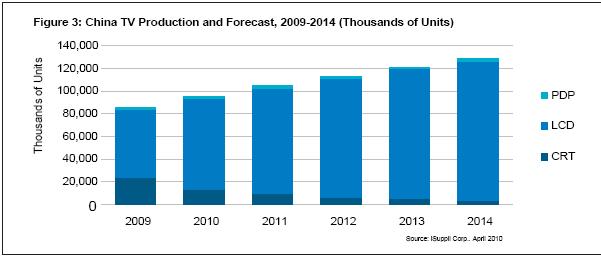據iSuppli公司,中國電視市場已經是全球舞台上的主角,預計2010年再度有強勁表現,整體電視產量上升,同時對於液晶電視的需求大增。