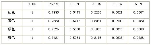 得到了在100%,75.9%,51.2%,22.8%,10.1%,5.9%霧濃度下,四種單色LED的透過率。取三次重複實驗的平均值,如表2所示。