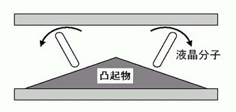 如圖,它依*叫做Protrusion的屋脊狀凸起物來使液晶本身產生一個預傾角(Pre-tiltAngle)。這個凸起物頂角的角度越大,則分子長軸的傾斜度就越小。早期的VA模式液晶凸起物隻在一側,後期的MVA凸起物則在上下兩端。
