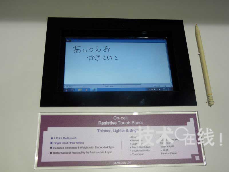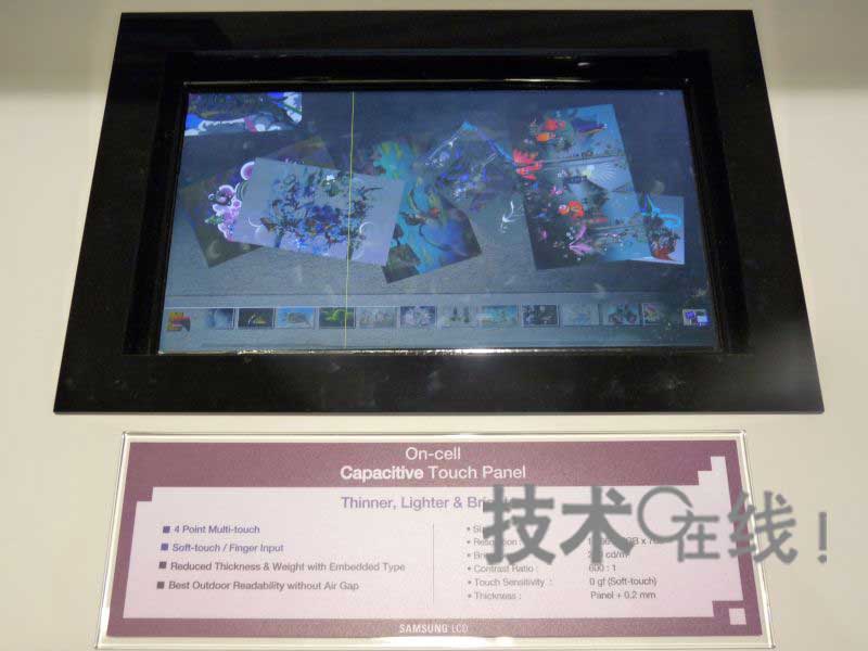 韓國三星電子此次展出了兩款內置觸摸麵板功能的On Cell方式液晶麵板。分別為是(1)嵌入電阻膜式觸摸麵板功能的10.1英寸液晶麵板,以及(2)嵌入靜電容量式觸摸麵板功能的13.3英寸液晶麵板。兩款產品均可4點輸入。目前正以2011年開始量產為目標推進開發。