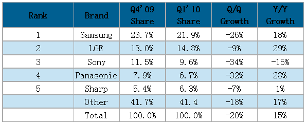 一季度三星電子(Samsung)出貨營收比率較去年第四季稍微下滑,不過利潤率相對較其它廠商好,出貨金額比率達21.9%。同時三星電子持續在新技術如LED與3D電視方麵領先其它廠商,這也是該公司持續良好增長與較高產品價格主要原因。以應用技術別來看,三星電子在LCD TV全球排名第一,在等離子電視則排名第二。