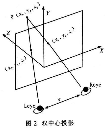 由以上研究可知,立體圖像對的產生是由於左、右(you)眼(yan)觀(guan)察(cha)到(dao)的(de)物(wu)體(ti)透(tou)視(shi)結(jie)果(guo)不(bu)同(tong)。因(yin)此(ci)在(zai)立(li)體(ti)顯(xian)示(shi)的(de)視(shi)景(jing)仿(fang)真(zhen)中(zhong)設(she)置(zhi)兩(liang)隻(zhi)虛(xu)擬(ni)的(de)眼(yan)睛(jing),一(yi)個(ge)獲(huo)取(qu)左(zuo)眼(yan)的(de)圖(tu)像(xiang),另(ling)一(yi)個(ge)獲(huo)取(qu)右(you)眼(yan)的(de)圖(tu)像(xiang),分(fen)別(bie)將(jiang)左(zuo)右(you)眼(yan)的(de)圖(tu)像(xiang)傳(chuan)送(song)給(gei)相(xiang)應(ying)的(de)眼(yan)睛(jing)。因(yin)此(ci)。在(zai)立(li)體(ti)顯(xian)示(shi)中(zhong),需(xu)要(yao)采(cai)用(yong)包(bao)含(han)兩(liang)個(ge)視(shi)點(dian)的(de)透(tou)視(shi)投(tou)影(ying)方(fang)法(fa)一(yi)雙(shuang)中(zhong)心(xin)投(tou)影(ying)算(suan)法(fa)。圖(tu)2為雙中心投影。
