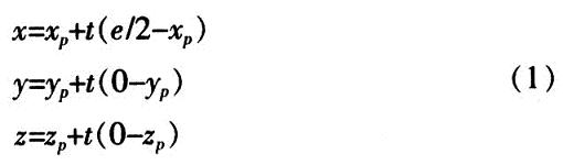 左視點Leye和右視點Reye均位於X軸上,兩視點間的距離為e,兩視點連線中心為坐標原點,則左視點的坐標為(-e/2,0,0),右視點的坐標為(+e/2,0,0)。投影平麵平行於XY平麵,到左右視點的距離均為d。三維空間中一點P(xp,yp,zp)在左視點投影中的坐標為(xl,yl,zl),在右視點投影中的坐標為(xr,yr,zr),則zl=zr=d。點P(xp,yp,zp)和Reye投影線的參數方程為: