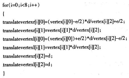 按上述投影算法計算出立體圖像對後,應用OpenGL繪製立體圖像對,分別用紅、綠兩種顏色繪製右眼和左眼的圖像。以一個變長為10cm,中心點在原點的正方體為例,設兩視點間距離e為5cm,投影麵距高觀察者d為40cm,考察正方體的一個頂點(5,5,5),由上述投影算法可得:xr=32cm,xl=48cm,yl=yr=4040cm,zr=zl=d=40cm對8個頂點分別計算後,連接相應的立體透視投影點,即可得該立方體的立體圖像對。用數組vertex[8][3]存儲頂點,數組translatevertexr[8][3]存儲右眼投影計算後坐標,數組translatevertexl[8][3]存儲左眼投影計算後的坐標,對相應的點進行投影計算: