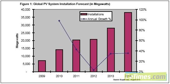預計今年全球光伏裝機容量將增長到14.2GW,比2009年的7.2GW大增97.2%,而且也沒有明年降溫的跡象。圖1所示為2009-2014年全球光伏裝機容量預測,2014年新增光伏係統預計將達到38.1GW。
