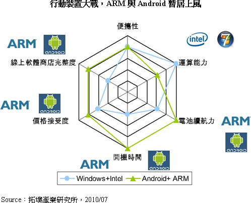 今年在智慧型手機作業係統及處理器都沒有發表新版本的情形下,2010年第二季智慧型手機較去年同期成長了43%,采用ARM處理器與Apple作業係統的iPad以每月出貨100萬台的速度快速成長。而搭載Intel Capella新平台及Windows 7的NB出貨量雖然也表現不惡,但第二季的年成長率隻有32%,兩者潛力高下立判。