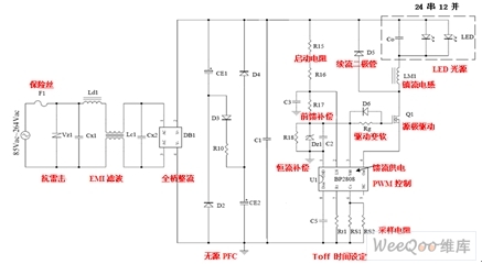 從AC220V看進去,交流市電入口接有1A保險絲F1和抗浪湧/雷擊的壓敏電阻Vz1;之後是EMI濾波器,由Ld1、Lc1和Cx1、Cx2組成;DB1是全橋整流器,內部是4個高壓矽二極管;CE1、CE2、R10、D2~D4組成無源功率因數校正電路;BP2808芯片由R15、R16啟動電阻降壓經R17、C3前饋補償,並由Dz1、C2、R18與BP2808內部電路組成專利的恒流補償電路穩壓後給BP2808控製電路供電,係統啟動後由於控製電路本身靜態電流小,以及芯片內部存在從OUT到VCC的饋流二極管可向BP2808提供工作電源,此時電阻R15-17上通過的電流將大大降低,因而總的係統功耗也大大降低,係統效率得到明顯提高。