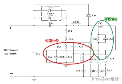 專利的源極驅動電路由MOS管Q1、D6、Rg、Rt、Rcs與BP2808內部電路組成,其顯著特點是有效降低功耗、提高恒流精度。源極驅動方式的驅動電路使係統消耗電流減少,尤其是減少了傳統的高壓差供電通路中類似R15-17上的電流,從而降低了功耗,提高了效率。D6、Rg可使開關開通驅動變軟,關斷驅動保持較強,既改善EMI,又盡量不犧牲效率。與LED光源並聯的輸出濾波電容C0用以減少LED光源上的電流紋波。