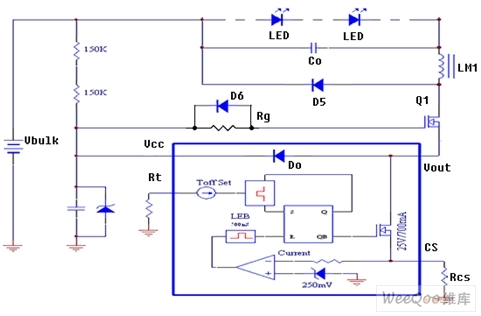 圖5是源極驅動控製電原理路,從中可見BP2808內部的低壓開關MOS管(700mA)漏極連接到外部功率開關MOS管Q1的源極,而其源極連接到采樣電阻RCS的一端以及第一比較器的輸入端,其柵極連接到RS觸發器的輸出端。外部功率開關MOS管Q1的漏極輸出電流經儲能電感直接驅動LED光源。芯片內的Do是饋流二極管,在BP2808啟動工作後,從OUT到VCC的饋流經Do整流向BP2808提供工作電源。
