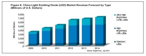 另外,憑借政府的支持和LED日益進入液晶電視及普通照明等新的應用領域,iSuppli公司預測,2014年中國LED營業收入將達到71億美元,而2009年是34億美元,其間的複合年度增長率為12.8%。超高亮度(UHB)LED的增長速度更快,到2014年銷售額將從2010年的6.86億美元上升到18億美元,複合年度增長率為26.9%。