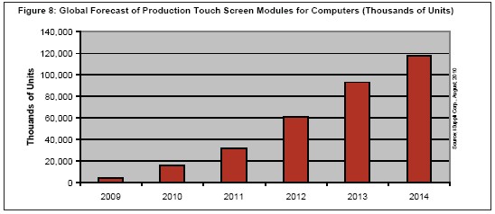 iSuppli公司預測,2014年用於電腦的觸摸屏模組全球產量將大增到1.179億個,而2010年是1580萬個。圖8所示為iSuppli公司對用於電腦觸摸屏全球產量的預測,包括台式機、移動PC和slate以及平板電腦產品。